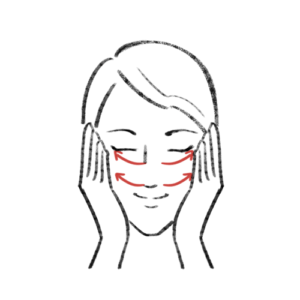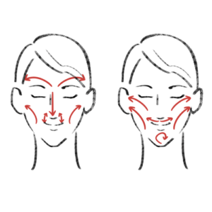 • 深呼吸聞香後,從面部中心至外的方向,以雙手掌心分別輕撫滑並塗抹至面頰、額頭及下巴位置(如圖)。